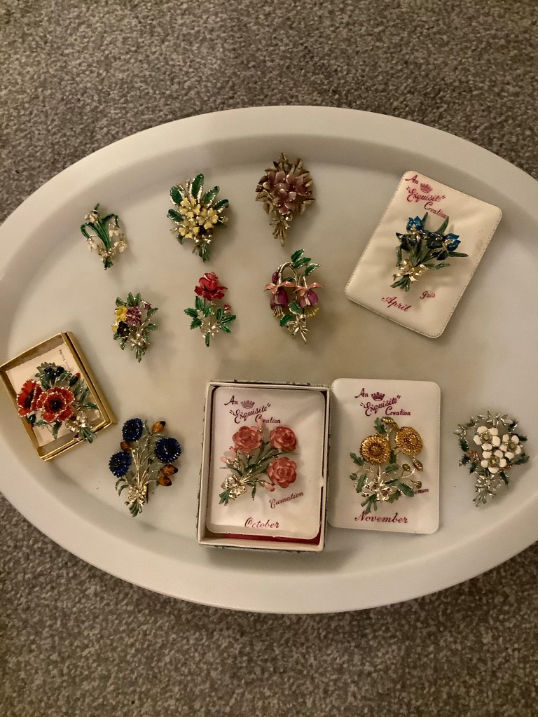When Woolworths was open these could be bought quite cheaply. They would be bought often as presents as they represented each month of the year. Each one was hand painted in the factory in Solihull , so I fell in love with them and obtained the set. Some I bought at Antiques fairs, one I spied on the market and some I bid for on eBay ! And as my friend had suggested I wore them often in the middle of tops as a brooch. They added interest to plain tops and have also been a talking point. I often think that much as I like skirts as well as dresses, often when we go out to restaurants , or pubs or supper with friends no one can see the skirt one is wearing as one is sitting, a pity really . So it’s fun to wear an eye catching brooch. I often wonder about the folk who sat and hand painted those brooches.